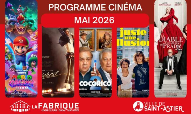 Retrouvez le programme cinéma du mois de mai 2026 de votre cinéma La Fabrique Saint-Astier !