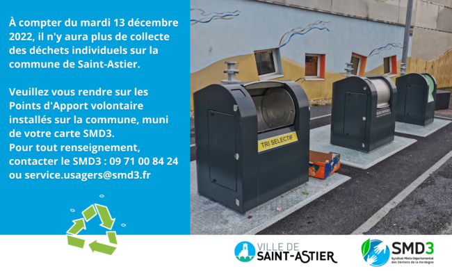La redevance incitative arrive bientôt sur Saint-Astier ! A partir du mardi 13 décembre 2022, les usagers devront se rendre sur les Points d’Apport volontaire installés sur la commune, muni de leur carte SMD3, pour jeter leurs déchets.