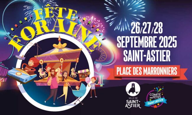 La ville de Saint-Astier en partenariat avec le comité des fêtes organise une fête foraine le 26, 27 et 28 septembre 2025 place des Marronniers.
