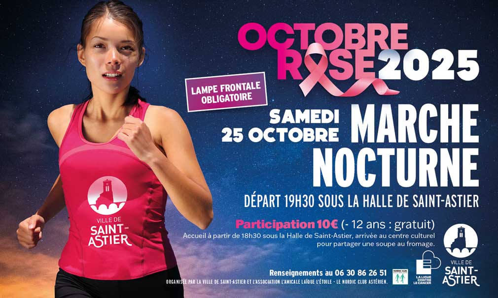 Rendez-vous samedi 25 octobre 2025 pour une marche nocturne à partir de 19h30 sous la halle de Saint-Astier.