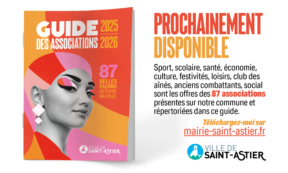 Retrouvez le guide des associations édition 2025/2026 de la ville de Saint-Astier ! Ce guide recense l’ensemble des associations de la commune, avec plus de 87 associations sportives, culturelles, de loisirs, de solidarité… Ce livret vous apporte toutes les informations utiles pour découvrir et pratiquer une activité. Le guide est disponible en ligne : ICI et prochainement en format papier.